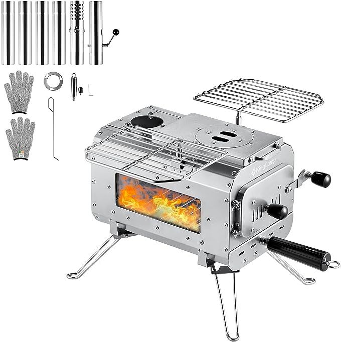 KingCamp Hot Tent Stove, Foldable Camping Stove with Large Firebox, 6.6ft Winter Camping Stove for Tent, Shelter, Cabin Heating, With Chimney Pipes, Heat Resistant Glass & Gloves for Outdoor