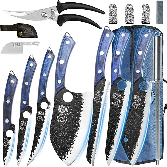 Portable Chef Knife Set by XYJ, a professional brand established in 1986. This set includes 7 camping knives, including a meat cleaver, gyuto knife, scissors, honing steel, and finger hole Serbian chef knives. All knives are full tang and made of high carbon steel. The set is color blue and comes with a convenient bag.